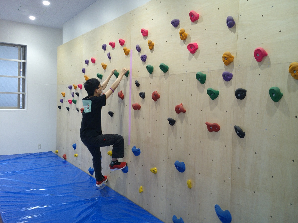 ボルダリングは一般的に上へ登りますが、当ジムでは長さ7mを横に進んでいきます。ホールド(持ち手)の色で難易度が変わるため、自身にあったものに挑戦できます。