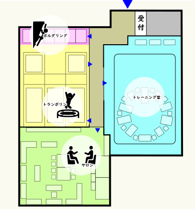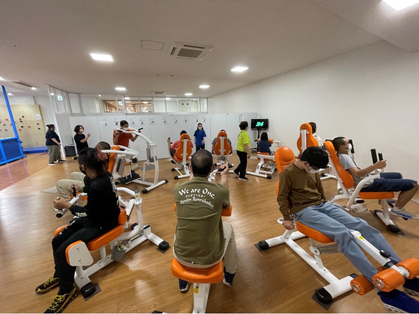 11種類のマシン+その場歩き、を繰り返し移動しながら1周します。音と数字で移動のタイミングを知らせる工夫をすることで、知的障害の方にも分かり易くします。