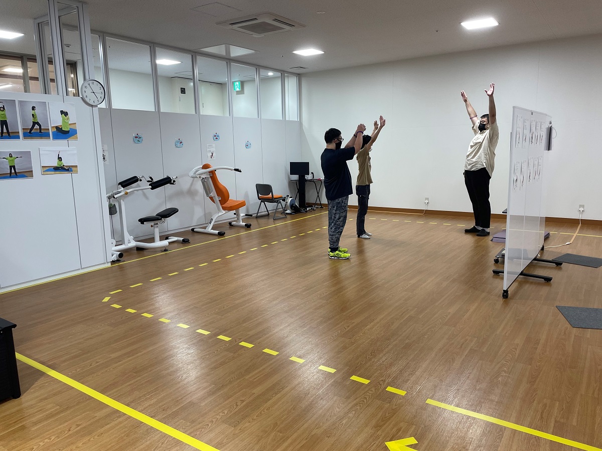 運動前の準備体操として、テレビの映像を見ながらラジオ体操を行います。また、ストレッチ用のマットを用意していますが、運動した後に座ってストレッチを行うことができます。